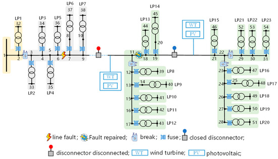 The LP1 to LPn in the figure represents medium voltage users 1 to n. It is assumed that at t = 0 a line fault occurs between nodes 6 and 7 with a repair time of 3 h, and another fault occurs between nodes 11 and 18 with a repair time of 2 h. During the first 2 h, since the lines have not been repaired, the network topology remains unchanged, as shown Figure 4.