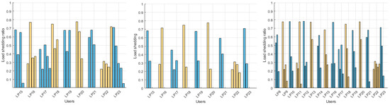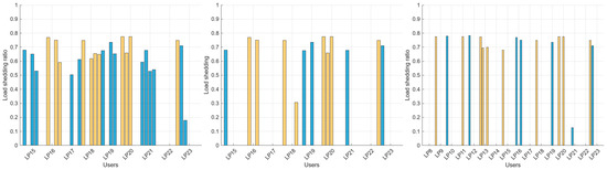 In order to distinguish between two adjacent medium-voltage users in the figure, we have used a yellow and blue format. Figure 8, Figure 9 and Figure 10 show that the load-shedding amount in the 2nd hour is less than that in the 1st hour. This reduction is due to the increased output from the DG with PV and WT units in the 2nd hour, which decreases the need for load shedding. In Case 1, the load-shedding amount for LP18 is minimal. According to the user importance results, LP18 has a relatively high importance level. Conversely, LP19 experiences the most load shedding because of its relatively low user importance. This result demonstrates that load shedding in the distribution network is performed according to the user importance, which confirms the effectiveness of the proposed outage sequence optimization strategy in minimizing the user importance loss in the distribution network.