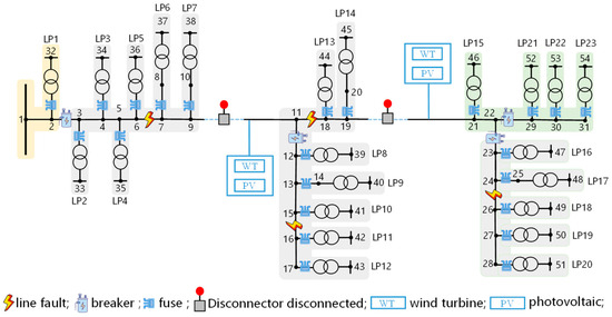 Once the fault between nodes 11 and 18 has been repaired at t = 3 h, the distribution network topology is as shown in Figure 5.