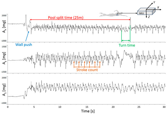 The experimental protocol consisted of a timed 50 m front crawl at maximal intensity, starting in the water and requiring a turn or touch at 25 m. A single lightweight (18 g) wearable device (Faros® 180 waterproof ECG, Bittium Corp., Oulu, Finland) simultaneously measured 3D-accelerometry and electrocardiography and recorded data on an internal memory board. The sternal 3D-accelerometry (sampling frequency: 100 Hz; dynamic range ± 16 g; precision 14-bit, IP class. IP67) provided information about external load, whereas the V5-lead electrocardiography (sampling frequency, 250 Hz) served as an indicator of exercise intensity, through the subsequent calculation of heart rate (HR) and high-resolution underwater videos (sampling frequency: 60 Hz). Standard ECG electrodes by FIAB® (Doctor Shop, Milan, Italy) were used, covered with a plastic sheet to keep them dry during the swim test. Both accelerometric and ECG data were recorded in standard EDF (European Data Format) files. Figure 1 displays a typical accelerometer recording obtained with the described setup, indicating the positioning and reference axes of the inertial measurement unit (IMU) used.