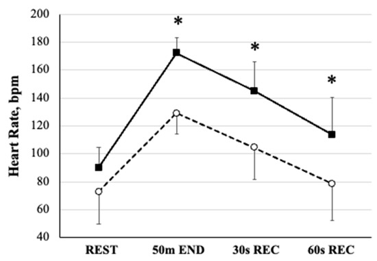 Figure 2. HR values at rest (REST), immediately after the 50 m front crawl test (50 m END), and after 30 (30 s REC) and 60 s (60 s REC) of post-test recovery. Data are presented as the mean ± SD. Black squares and continuous line: CNT group; White circles and dashed line: SDS group. The * indicates differences between the SDS vs. CNT groups significant at p < 0.001 in the post-hoc analysis of two-way ANOVA.