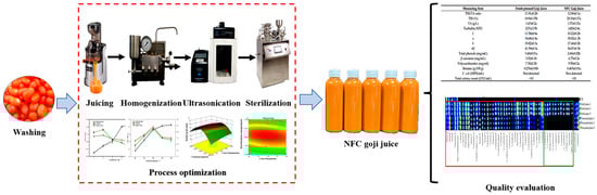 The homogenisation time, ultrasonication time, sterilisation temperature, and sterilisation time were selected as independent variables. The processing technology was optimised by measuring the TSS/TA ratio, turbidity, and sensory evaluation scores of the NFC goji juice.