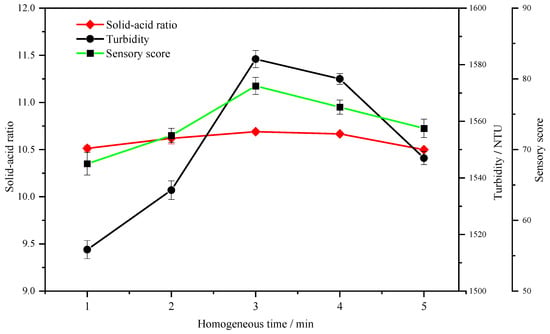 Homogenisation breaks down and refines suspended particles in fruit juice, reducing average particle size, enhancing dispersion, and improving sensory properties [25,26]. As shown in Figure 2, a homogenisation time of 3 min resulted in the highest turbidity and sensory scores for NFC goji berry juice, measured at 1582 NTU and 79 points, respectively. This is because an optimal homogenisation time impacts large particles, such as fats, fibres, and proteins, through impact and shearing, resulting in smaller, uniformly dispersed particles that enhance juice stability.