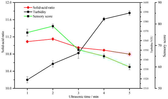 Ultrasonic treatment can enhance fruit juice quality and delay its deterioration [30]. As shown in Figure 3, the NFC goji juice exhibited the highest TSS/TA ratio (11.15) and sensory score (79%) at an ultrasonication time of 2 min, along with increased turbidity. This improvement is attributed to ultrasonic cavitation effects, which break down large molecules such as pectin in the juice, thereby reducing viscosity and enhancing juice quality [31]. This finding aligns with the results of Tiwari [32], who reported improved stability and quality of blackberry and tangerine juices through ultrasonic treatment.