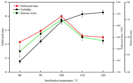 The effect of sterilisation temperature on juice quality is illustrated in Figure 4. At a sterilisation temperature of 100 °C, the juice achieved the highest TSS/TA ratio and sensory score, at 18 and 75 points, respectively, with a turbidity of 1294 NTU. However, as the temperature increased to 110 °C, juice quality declined, with a 15.56% decrease in the TSS/TA ratio and a 6.67% decrease in the sensory score compared to those at 100 °C. This decline is attributed to higher sterilisation temperatures causing flocculation in the juice, where the precipitate adsorbs some of the total soluble solids (TSS), resulting in decreased TSS content [36]. Yang’s [36] study on the impact of heat treatment on noni juice quality indicated that low-temperature heat treatment (85 °C for 5 min) significantly increased juice TSS (p < 0.05), whereas medium and high-temperature treatments (100 °C and 115 °C for 5 min each) decreased TSS content. This suggests that low-temperature heat treatment can better maintain juice quality. However, in the current study, 100 °C provided the best juice quality, likely due to the short duration of high-temperature instantaneous sterilisation, which did not adversely affect the juice quality.