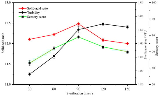 The impact of sterilisation time on the quality of NFC goji juice is depicted in Figure 5. As sterilisation time increased, the turbidity of the juice also increased. When the sterilisation time was 90 s, the juice achieved a higher TSS/TA ratio and sensory score, measuring 12.48 and 79%, respectively. At 120 s, the TSS/TA ratio and sensory evaluation score decreased by 7.6% and 3.2%, respectively, compared to the 90-s mark. Significant differences (p < 0.05) were observed in TSS/TA ratio, turbidity, and sensory evaluation values across different sterilisation times. When the sterilisation time was extended to 150 s, the TSS/TA ratio decreased to 12.1. This is attributed to longer medium-to-high-temperature heat treatments, which alter the content of TSS and organic acids in the juice system, thereby affecting the taste and overall quality of the juice [33].