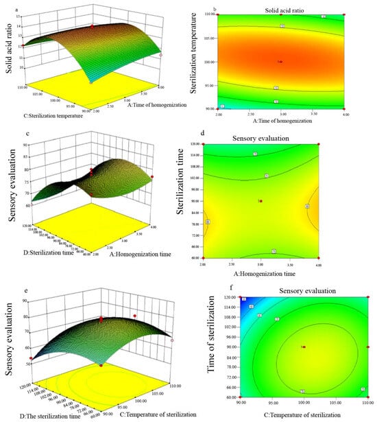 To visually represent the interaction effects of factors A (homogenisation time), B (ultrasonication time), C (sterilisation temperature), and D (sterilisation time) on the response variable Y, three-dimensional surface plots and contour plots were generated using Design Expert 8.0.6 software. As shown in Figure 6, a steeper response surface with a larger inclination indicates a greater impact of the interaction between the factors on the response value. Conversely, a flatter surface suggests a lesser impact. If the contour line is oval or saddle-shaped, it signifies a highly significant interaction between the two factors, whereas a circular contour line indicates a non-significant interaction [38]. According to the plots, the interactions between A and C, and the interactions between A and B, the difference is striking (p < 0.01). The interactions between C and B and between C and D were significant (p < 0.05). These interactions significantly affected the response value, which is consistent with the results presented in Table 8.