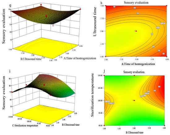 Surface plot and contour plot of interaction of various factors from NFC wolfberry juice (a,b). Effects of Response surface plots and contour lines on the interaction of homogenization time and sterilization temperature, (c,d). Effects of response surface plots and contour lines on the interaction of homogenization time and sterilization time, (e,f). Effects of response surface plots and contour lines on the interaction of sterilization temperature and sterilization time, (g,h). Effects of response surface plots and contour lines on the interaction of homogenization time and ultrasonication time, (i,j). Effects of response surface plots and contour lines on the interaction of ultrasonication time and sterilization temperature).
