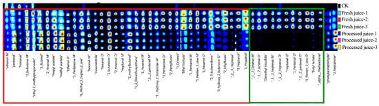 The results indicated significant differences in the volatile substances between freshly pressed and processed goji juice, highlighted in red and green boxes. Volatile compounds in the red box were present in both juices before and after processing (Table 9: 1–36). Compared with fresh wolfberry juice, the relative contents of 2-hexenaldehyde-M, hexaldehyde-M, and 2-methylbutyraldehyde in NFC wolfberry juice increased by 0.07%, 0.08% and 0.18%, respectively. It may be due to the release of aldehydes promoted by processing. Esters such as ethyl propanoate and methyl acetate, which have a fruity aroma, increased by 0.03% and 0.22%, respectively, after processing. The relative contents of alcohols such as butanol and ethanol-D increased by 0.09% and 1.04%, respectively. Alcohols, important precursors of long-chain ester compounds, are mainly derived from the reduction of amino acids and oxidation of fats [39], serving as crucial aromatic substances. The relative content of 16 volatile compounds—1,2-dimethoxyethane, 1-hexanol-M, (E)-2-pentenal-M, 3-hydroxy-2-butanone-M, 3-pentanone-D, 2-pentylfuran, 3-octanol, 1-pentanol-M, 1-penten-3-one-M, 1-hexanol-D, 2,3-butanedione, 3-hydroxy-2-butanone-D, 2-ethylfuran, (Z)-4-heptenal, 3-heptanol, and propanol—in the red box decreased after processing. This decrease is possibly due to the degradation of some compounds caused by changes in conditions such as cell rupture, light, oxygen, and temperature during homogenisation, ultrasonication, and sterilisation. The compounds in the green box area—(E)-2-octenal-M, (E)-2-octenal-D, dimethyl trisulfide, 2-heptenal-M, 2-heptenal-D, heptanal-D, 1-pentanol-D, (E)-2-pentenal-D, 1-penten-3-one-D, butyl lactate, and alpha-phellandrene—had very low contents (0.1–0.37%) in the processed NFC goji juice. Among these 11 volatile substances, (E)-2-octenal (monomer, dimer), 2-heptenal (monomer, dimer), (E)-2-pentenal (dimer), and 1-pentene-3-one (dimer) are aldehydes and ketones containing unsaturated bonds, which degrade more quickly under high-temperature processing, reducing their relative content. Phenylacetaldehyde and 2-heptanone, which have fruity aromas, significantly increased in relative content after processing by 0.21% and 0.07%, respectively. This increase is likely due to high-temperature sterilisation promoting the degradation and oxidation of unsaturated fatty acids, enhancing the juice’s flavour. Overall, the total relative content of volatile flavour substances in NFC goji juice decreased by 19.86% after processing.