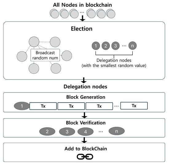 Once the delegate nodes are selected, they proceed with block generation and verification using the practical Byzantine fault tolerance (PBFT) method. The primary delegate node proposes a block, and the other delegate nodes verify it. If validated, the block is added to the blockchain, ensuring secure and efficient block generation and verification.