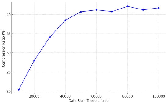 In order to address the increased signature sizes associated with post-quantum cryptography algorithms such as Falcon and Dilithium, we incorporated a block compression algorithm to optimize the storage and transmission efficiency. The graph in Figure 2 illustrates the compression ratio achieved as the size of the transaction data increases. The compression algorithm was tested with varying data sizes ranging from 10,000 to 100,000 transactions. The corresponding compression ratios (%) were measured. As seen in Figure 2, the compression ratio increases as the data size grows, reaching a peak of 42.12% at 80,000 transactions. Beyond this point, the compression ratio stabilizes between 40% and 42%. This suggests that the compression algorithm is particularly effective for larger data sets, reducing storage requirements by over 40% in scenarios with large transaction volumes. This improvement in data compression allows for better scalability of the blockchain network by accommodating the larger signature sizes introduced by post-quantum algorithms. Moreover, the compression helps to offset the increase in storage space required for post-quantum signatures, ultimately enhancing the blockchain’s efficiency without compromising security.