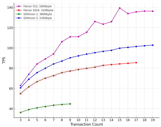Falcon-512 shows strong post-quantum security while maintaining a peak TPS of 136 at a transaction count of 18, making it well-suited for environments demanding both security and performance. Falcon-1024, while also delivering robust post-quantum security, shows lower TPS values compared to Falcon-512 due to its larger transaction size (3100 bytes). However, its performance remains competitive, reaching a TPS count of approximately 64 at a transaction count of 19. This demonstrates that Falcon-1024 can still be a viable option for systems that require even stronger security assurances, albeit with a moderate reduction in TPS. On the other hand, the Dilithium algorithms exhibit lower TPS values across all transaction counts. Dilithium-2, which has a transaction size of 3800 bytes, achieves a maximum TPS value of only 44, and Dilithium-5, despite offering stronger security with a transaction size of 5300 bytes, peaks at around 84 TPS. The larger transaction sizes of the Dilithium algorithms, while providing enhanced security, result in a significant reduction in TPSs, making them less efficient for high-throughput blockchain systems.