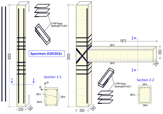 The first column specimen (JC0V) is used as a pilot specimen, whereas the column part of the second one was strengthened with the application of C-FRP ropes. Ropes are used as external longitudinal reinforcements for the strengthening of the column against flexure (Figure 3). Further, C-FRP ropes are applied as external stirrups for the confinement of the critical end parts of the column, too. Finally, ropes are also applied in the form of diagonally placed stirrups for the shear strengthening of the joint body of the specimen (specimen JC0F2X2c).