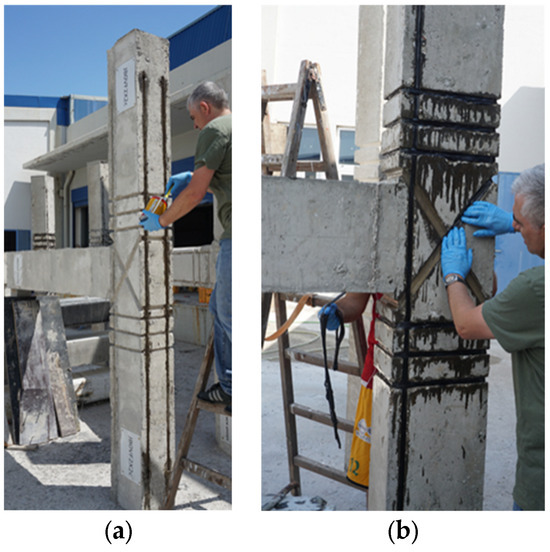 Furthermore, inside the grooves the corners of the column in the notches have to be well rounded by grinding and any protrusions on the surfaces have to be smoothed to ensure optimal adhesion and performance of the C-FRP ropes. The placement of the longitudinal C-FRP ropes in the grooves along the height of the column is presented in Figure 4a, whereas the application of the C-FRP ropes as external shear reinforcement in X-formed grooves at the two sides of the joint panel is presented in Figure 4b.