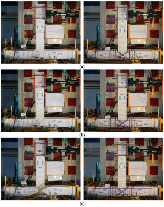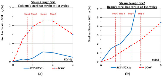 The maximum strain values of strain gauge SG2 mounted on a steel bar of the flexural reinforcement of the beam at the edge of the connection panel are presented in Figure 14b for the two tested specimens. From this comparison, it is observed that the steel strain of the reinforcement of the beam in the case of the strengthened specimen JC0V2X2c attains high values, indicating that this area suffered damage. It is emphasized that from the strain gauge measurements, it is substantiated that the column and the connection panel of the strengthened specimen remained almost intact, whereas damage and eventually failure is located in the column in the beam of the strengthened specimen.