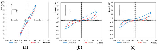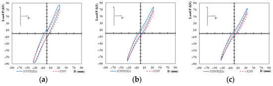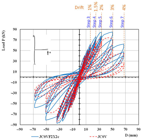 Comparisons of the hysteretic response of the specimens for the fifth and the seventh loading steps are presented in Figure 7 and Figure 8, respectively. In particular, comparisons of the response cycles of the two specimens for the first cycles of the fifth loading step are presented in Figure 7a, for the second cycle of the fifth loading step in Figure 7b, and for the third cycle of the fifth loading step in Figure 7c. From Figure 7, it is observed that the damage level of specimen JC0V is higher than the one of specimen JC0V2X2c since the observed maximum loads per loading cycle are lower than the ones of the strengthened specimen. Further, comparisons of the response cycles of the two specimens are presented for the first cycle of the seventh loading step in Figure 8a, for the second cycle of the seventh loading step in Figure 8b, and for the third cycle of the seventh loading step in Figure 8c. From Figure 8c, it is apparent that the specimen JC0V failed prior to the seventh step. The observed loads of the strengthened specimen are higher than the ones of the unstrengthened specimen; the decrease in the load capacity of the strengthened specimen is mainly attributed to the yielding of the steel reinforcement of the beam.