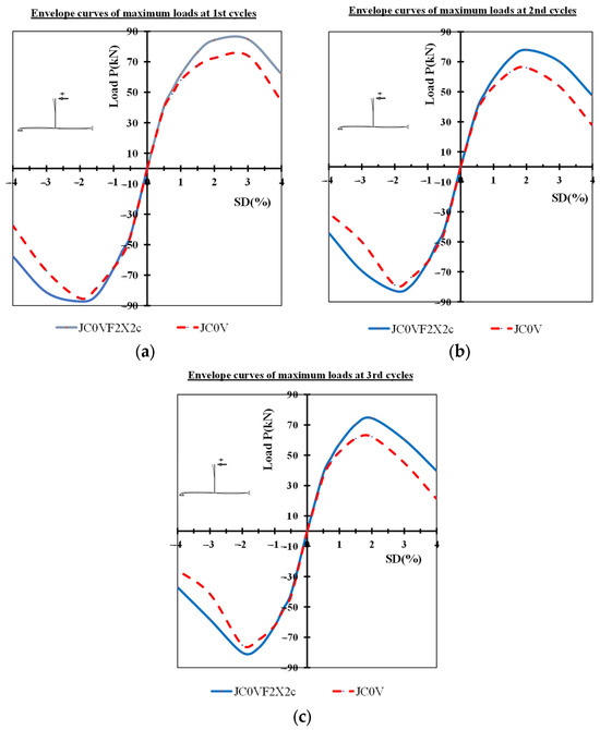 Comparison of the envelope curves of the tested specimens: (a) envelope curves of the maximum loads at the 1st cycles of each loading step, (b) envelope curves of the maximum loads at the 2nd cycles of each loading step, (c) envelope curves of the maximum loads at the 3rd cycles of each loading step.