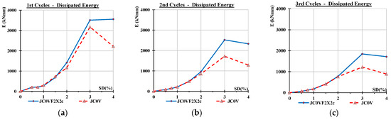 An indicative parameter for the assessment of the overall seismic capacity of the tested columns is the dissipated energy in terms of the area of the cyclic hysteretic response of the tested elements. The comparative presentation of the observed dissipated energy of the tested specimens in terms of the area of the hysteretic cycles is presented in Figure 11. In particular, the dissipated energy of the first cycles, the second cycles, and the third cycles of each loading step are presented in Figure 11a–c, respectively. From the comparisons of Figure 11 between the two specimens, it is apparent that the energy dissipating capacity of the pilot specimen is lower than the capacity of the strengthened specimen. Further, it is noted that the differences increase as the loading becomes higher since the damage of the pilot specimen increases excessively compared to the damage of the strengthened one.