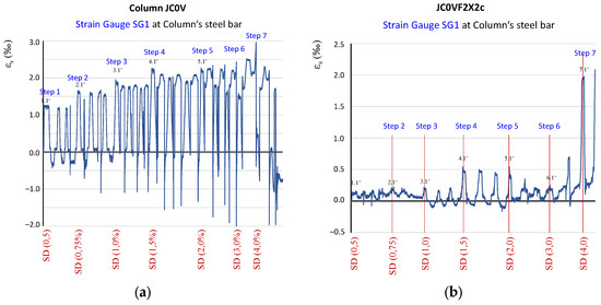 History of the strain values of the steel bars of the column of the tested specimens. (a) Strain values as recorded from the strain gauge SG1 mounted on a column bar of specimen JC0V and (b) strain values as recorded from the strain gauge SG1 mounted on a column bar of specimen JC0VF2X2c.