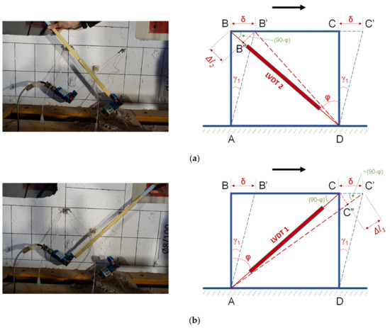 where is the elongation of the diagonal string-LVDT, is the shortening of the other diagonal string-LVDT, L is the initial length of the strings of the string-LVDTs, and ϕ is the inclination angle of the diagonals of the joint panel (Figure 15).