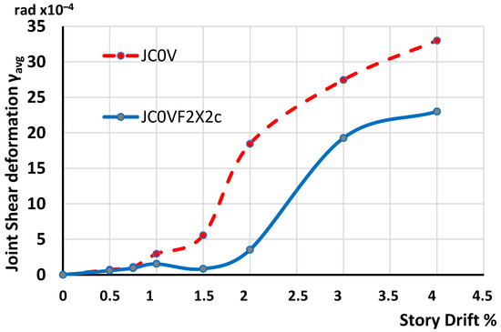 Thus, the diagonal elongations and diagonal shortenings of the joint panel of the tested specimens were measured by the two string LVDTs at each step of the loading procedure. Subsequently, the maximum values of the shear deformations of the joint panel of the two tested specimens were calculated based on Relationship 1. The shear deformations of the specimens are presented per story drift in Figure 16. In this figure, the absolute values of the maximum shear deformations of the joint panel of the strengthened specimen JC0V2X2c are compared with the corresponding values of the shear deformations of the specimen JC0V per loading step and drift. It is apparent that the maximum shear deformations of the connection panel of the strengthened specimen JC0VF2X2c are lower than the corresponding ones of the pilot unstrengthened specimen JC0V. It is a strong indication that the strengthening technique increases the strength and the stiffness capacity of the column and decreases the deformations and the damages in comparison with the ones of the specimen JC0V.