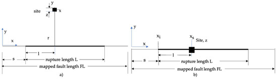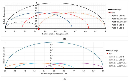 Let us fix the mapped rupture length FL and the site’s coordinate . In Figure 2a, , and in Figure 2b, . The starting point, and rupture length, L, vary in Figure 2. For illustration purposes, elliptical displacement distribution is assumed along the rupture length; however, the values are used only for illustrating the physical picture. The lengths and coordinates in Figure 2 are normalised to the fault length, FL. The displacements are normalised to the maximum displacement at l = 0.5 × FL.