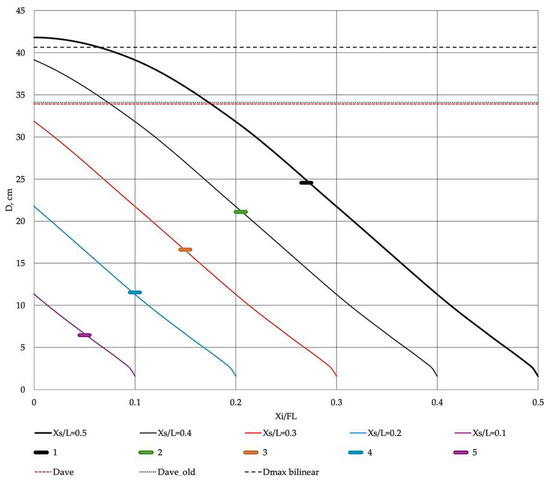 Here, the displacement distributions versus relative coordinate were calculated by Equations (5) and (6) for the magnitude of 6.5 and for the relative site locations equal to 0.5 (mid fault), 0.4, 0.3, 0.2 and 0.1 separately. The numbers 1–5 indicate the expected displacements that are defined assuming a uniform distribution of along [). The average displacement given by Equation (4) is also plotted in Figure 4. The black dotted line is the displacement value used in [5]. The black dashed line is the maximum displacement according to the bilinear distribution [26].