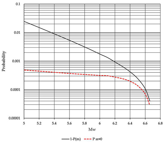 where the conditional probability is defined in [5] as the weighted average of the empirical relations by [37,38,39]. Figure 5 shows the magnitude exceedance probability and the probability of the non-zero surface rupture versus the magnitude.