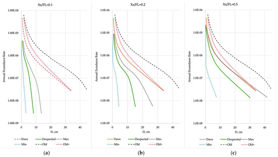 Figure 7 shows the annual exceedance rates for displacements at and calculated for ruptures with different in the range of . These are the possible contributors to the site hazard. The ruptures with and are the two extremes contributing to the hazard, giving the largest and smallest possible displacements. The green lines refer to the expected displacement AER, and the dotted lines indicate the AER curves of the maximum and minimum contributors to the displacement hazard. Thus, the minimum and maximum curves bound the possible contributors, including the physically possible largest and lowest contributors with and , respectively. A minor exception is in the case of , in the interval 10−7/a to 5 × 10−8/a where the contribution to the hazard rupture with slightly exceeds the predicted maximum curve.