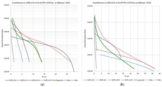 The AER curves of the contribution to the site hazard ruptures in the range of for the site positions (a) and (b). The green lines refer to the AER of the expected displacement, and the dotted lines indicate the obtained maximum and minimum displacement AER curves.