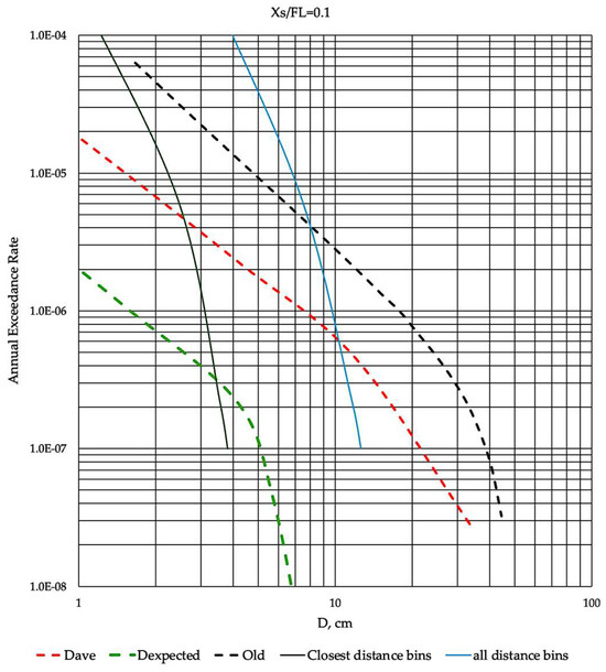 The first attempt [4] has been made based on the Probabilistic Seismic Hazard Analysis for the site, which has been updated and reviewed by independent experts several times during the last 30 years. The seismic hazard disaggregation has been considered to define earthquakes’ contribution to the hazard at fixed annual probability levels and their distribution in distance bins. The displacements were calculated by magnitude−displacement scaling correlations. It should be noted that the middle part of the Pannonian Basin is characterised as an area of diffuse seismicity. Since distance bins do not comply with the fault geometry, two options have been considered: (1) accounting for the distance bin that coincides with the site; and (2) considering all distance bins having essential contributions to the site’s seismic hazard. The next effort was developing a method that followed the logic of PFDHA; however, the parameters of the fault activity were defined by the weighting of parameters of area sources of the PSHA (maximum magnitude, the rate of the minimum magnitude and the slope of the Gutenberg–Richter distribution) [5]. Since the considered fault is just below the plant, the principal displacement was calculated using the procedure in [26].