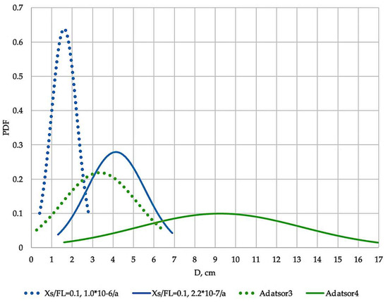 First, investigate the percentage of displacements within the calculated minimum and maximum values interval. Since the negative displacements do not make sense, a truncated normal distribution or a lognormal distribution is a reasonable assumption. However, assuming normal distribution with , is rarely negative. Therefore, as a first assumption, the normal distribution is used with the expected value for the mean and half of the difference between the expected and maximum values for . Figure 9 shows the density functions calculated for site position cases at and and for the ~10−6/a and ~10−7/a levels. The parameters of the density functions are shown in Table 4.