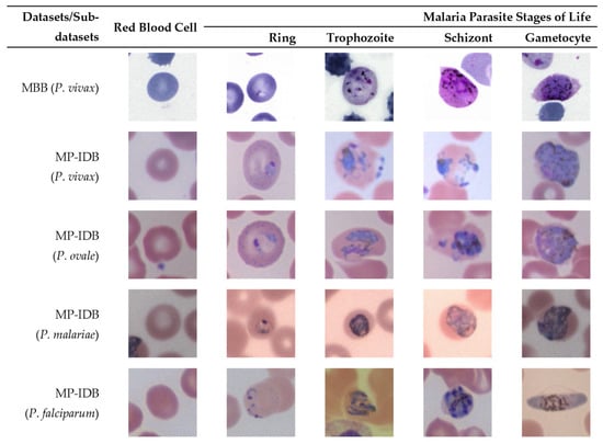 The second dataset is the Malaria Parasite Image Database for Image Processing and Analysis (MP-IDB) dataset [36], available at https://link.springer.com/chapter/10.1007/978-3-030-13835-6_7 (accessed on 10 March 2023). There are four different species of malaria parasites in this dataset, i.e., P. vivax (40 images), P. ovale (29 images), P. malariae (37 images), and P. falciparum (104 images). For each species, there are four distinct stages of life, i.e., ring, trophozoite, schizont, and gametocyte. The four sub-datasets are named as “MP-IDB (P. vivax)”, “MP-IDB (P. ovale)”, “MP-IDB (P. malariae)”, and “MP-IDB (P. falciparum)”.