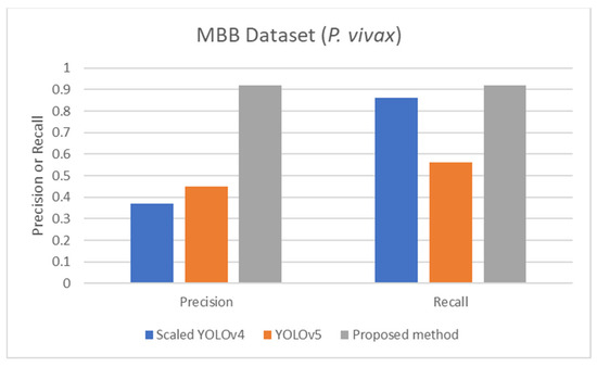 only the detection regions with IOU above a thresholding value are kept. In this research, the thresholding value is set to 0.8. This approach can filter the original detected regions and then increase the malaria parasite detection performance. It is worthwhile noting that, for the MBB dataset, 1208 training images are used to train the training models while 120 test images are used in testing. Meanwhile, all multi-cell images in the MP-IDB dataset are used for testing purposes only.