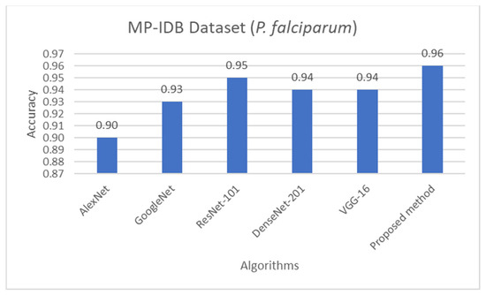 Comparison of accuracy of life stage classification achieved by different works including AlexNet [58], GoogleNet [58], ResNet-101 [58], DenseNet-201 [58], VGG-16 [58], and the proposed method, on the MP-IDB dataset when only P. falciparum is considered.