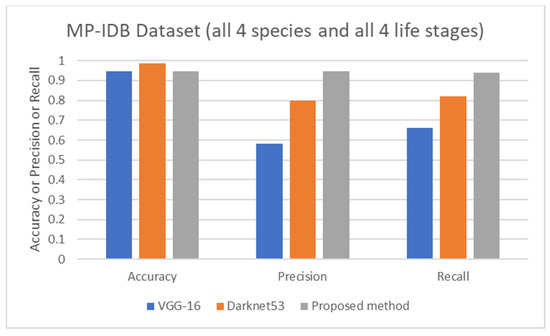 Comparison of average accuracy, average precision, and average recall of life stage classification achieved by different works including VGG-16 [62], Darknet53 [62], and the proposed method, on the MP-IDB dataset when all 4 species and 4 life stages are considered.