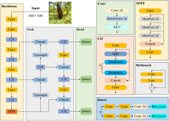 YOLOv8, as an important version of the YOLO series algorithms, has been widely used in various fields. Considering the deployment requirements of mobile platforms, this study has selected YOLOv8n, the smallest model in terms of size, as the baseline model. The schematic of YOLOv8n is presented in Figure 2 [14].