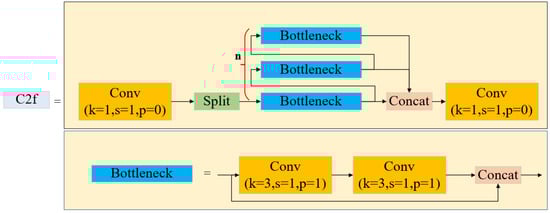 The Backbone network consists of standard convolution (Conv), C2f, and spatial pyramid pooling—fast (SPPF). The Conv module utilizes convolutional kernels to extract pixel-level information from images. Based on the C3 module in YOLOv5 and the ELAN module in YOLOv7, the C2f module incorporates extra branches to acquire more detailed gradient flow information [17]. C2f’s structure is illustrated in Figure 3 [14]. The SPPF module utilizes pyramid pooling to pool input features, generating a series of feature vectors corresponding to different pooling kernel sizes. Then, feature concatenation is performed.