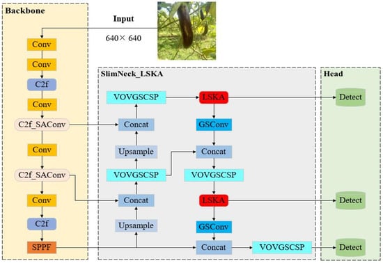 In Section 3.2.2, the Backbone and Neck in YOLOv8n have been reconstructed by integrating the SAConv and SlimNeck modules. However, our experiments revealed that when confronted with massive small target instances in eggplant disease images, this structure still struggled to effectively integrate fine-grained feature information, leading to low small target detection performance. To elevate the model’s efficiency in extracting important features of small disease targets, this study incorporated the LSKA modules into the SlimNeck network.