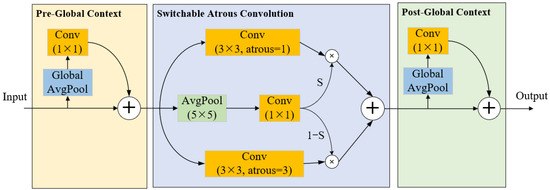 The SAC structure also incorporates two global context modules, positioned before and after the SAC component, respectively. The two modules augment the features with image-level information, enabling the network to better comprehend and process the overall content of the image, thereby enhancing the quality and accuracy of feature extraction. Global context modules consist of a global average pooling layer and a 1 × 1 convolutional layer, and their output is obtained by adding the input features to the output of these layers. The SAConv is portrayed by the equation given below: