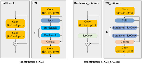 By combining the C2f and SAConv modules, this study designed the C2f_SAConv module, with its structure shown in Figure 6. The second Conv module in the Bottleneck is replaced by an SAConv layer with a variable receptive field. Subsequently, all BottleNecks in C2f are replaced with the improved BottleNeck_SAConv. Furthermore, some C2f modules were replaced with the improved C2f_SAConv in the Neck network, enabling the detection network to adaptively select convolution results with different receptive fields in complex field environments to extract a more extensive array of feature details from images, thereby enhancing the Backbone’s learning of target features with various scales and complex shapes.