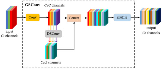 SlimNeck consists of GSConv and the cross-stage partial network module VOVGSCSP. The GSConv module’s structural design is given in Figure 7 [21]. Firstly, this module diminishes the channel count to half of the output channels through standard convolution, then applies depthwise separable convolution (DSConv) [22] for further processing, and merges the outputs of the two through the Concat module. Ultimately, the shuffle module is employed to uniformly distribute local feature data among diverse channels, thereby restoring the initial channel count. This approach maintains abundant channel information while minimizing the computational overhead.