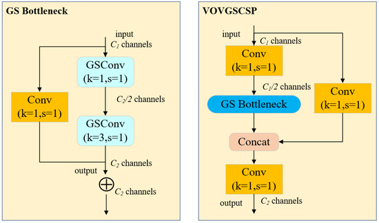 The structure of VOVGSCSP is shown in Figure 8 [21]. Initially, the input feature information is divided into two separate streams: one lowers the number of channels through convolution operations, while the other is processed through a GS Bottleneck after changing the number of channels. Then, these two parts’ outputs are concatenated, and another convolution operation is performed to change the output channels. This structural design allows gradients from different locations to mix and cross, enhancing the network’s learning ability to some degree.