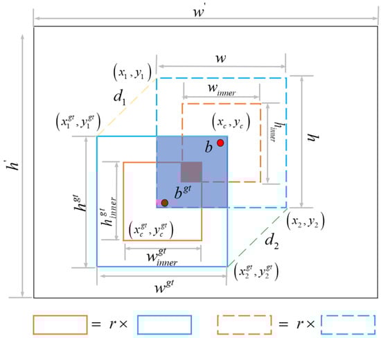 In Figure 10, the black rectangle signifies the input image, with and indicating its height and width. The top-left corner coordinates for the truth and predicted boxes are labeled as and , while their bottom-right corner coordinates are indicated by and , respectively. Below is the formula for the Inner-MPDIoU loss function: