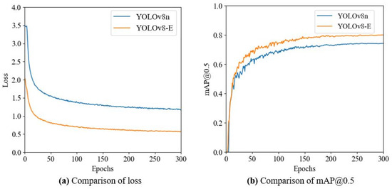 As depicted in Figure 11a, we visually compared the loss trends between the YOLOv8-E and the YOLOv8n model trained over 300 iterations. The analysis revealed that both the baseline and the enhanced network exhibited stable training performance, with minimal fluctuations in their overall loss values. However, the loss of YOLOv8-E is notably lower than that of the YOLOv8n model, with no signs of overfitting or underfitting. The average precision curves of models are presented in Figure 11b. During the early stages of training, YOLOv8-E intersected with YOLOv8n, but around the 15th epoch, the improved model began to surpass the baseline model, achieving stable improvement and convergence, ultimately attaining higher detection accuracy than YOLOv8n.