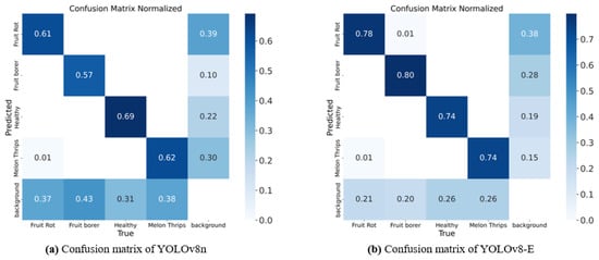 After training models, we utilized the validation set to verify the detection effectiveness of the trained YOLOv8n and YOLOv8-E models on eggplant diseases, and the obtained confusion matrix is shown in Figure 12. The confusion matrix comprises two dimensions: columns signify the categories predicted by the model, while rows denote the genuine annotated categories. Before the improvement, due to varying sizes and irregular shapes of disease targets, as well as complex factors such as occlusion and overlap, many disease targets were missed. Among them, the detection accuracy for fruit borer was the lowest, at only 57%. After the improvement, the model’s detection performance for various diseases greatly improved. The detection accuracy for rotten fruit disease and yellow spot disease increased by 0.17 and 0.12, respectively, with the most notable improvement observed in fruit borer detection, which reached 0.23. This validates that the YOLOv8-E model significantly outperforms YOLOv8n in accurately predicting disease categories. Furthermore, YOLOv8-E effectively reduced the missed detection of various disease targets.