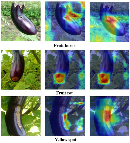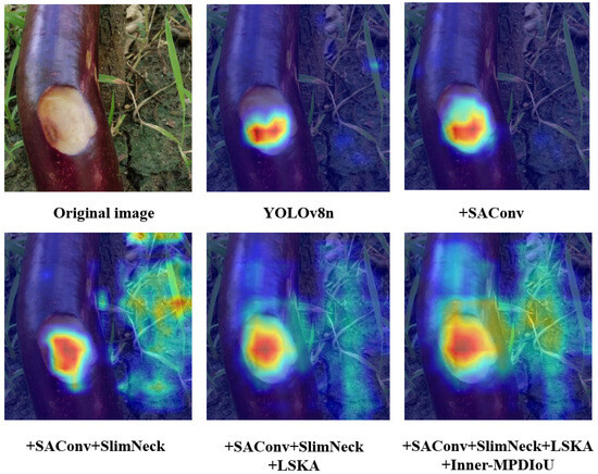 Gradient-weighted class activation mapping (Grad-CAM) [32] currently plays a pivotal role in the field of computer vision, specializing in visualizing feature maps from convolutional layers in deep neural networks and transforming them into heat maps for display. Heat maps [33], as a form of image representation, utilize color mapping to intuitively convey data distribution and intensity information, where variations in color signify different levels of activation or importance, effectively revealing the model’s attention to specific image regions. Specifically, brighter colors (such as red) typically indicate higher levels of activation, suggesting that the model pays more attention to these areas, while darker colors (such as blue) indicate lower levels. By observing the heat maps, we can easily gain insight into how the model focuses on areas of interest within the feature maps. In this study, we extracted Grad-CAM data from both the YOLOv8n and YOLOv8-E models and utilized the generated heat maps to evaluate their performance in the task of eggplant disease detection, as illustrated in Figure 13. Compared to the baseline model YOLOv8n, YOLOv8-E demonstrated a more pronounced focus on disease-related features, and this contrast strongly attests to the superiority of YOLOv8-E in detecting eggplant disease targets.