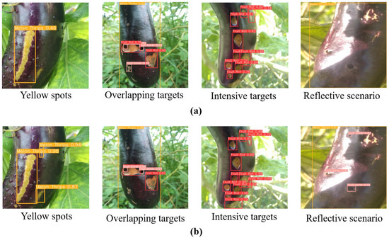 To intuitively demonstrate the efficacy of the YOLOv8-E network in eggplant disease detection in complex scenarios, we tested both YOLOv8 and YOLOv8-E in various complex scenarios, with the detection results given in Figure 15. When detecting yellow spots alone, YOLOv8 missed some targets, while YOLOv8-E detected those missed targets with a high confidence score. In scenarios with overlapping targets, YOLOv8 exhibited confusion between individual disease targets and background factors, whereas YOLOv8-E accurately identified various diseases with higher confidence. In scenarios with dense targets, YOLOv8 still missed some targets, whereas YOLOv8-E could more comprehensively detect those overlooked by YOLOv8. Furthermore, in reflective scenarios, YOLOv8 failed to detect all borers, whereas YOLOv8-E accurately identified these targets, indicating that YOLOv8-E maintains excellent detection performance and robustness even under environmental interference. These detection results conclusively prove that the improved YOLOv8-E manifests outstanding performance in detecting and classifying eggplant diseases in complex scenarios, rendering formidable technical aid in preventing and controlling field diseases.
