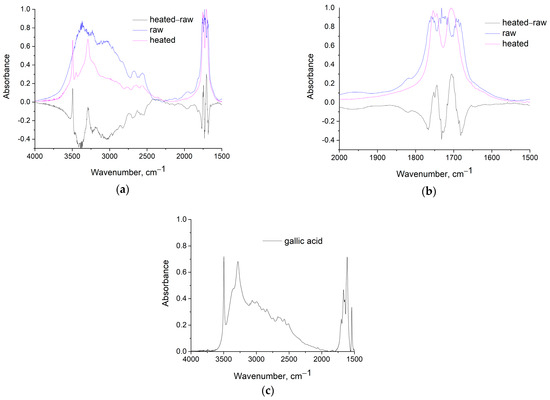 (a) FTIR spectra of the raw and the heated at 100 °C samples and their subtracted spectra (heated-raw) in the 1500–4000 cm−1 region, (b) Same spectra as in (a) in the 1500–2000 cm−1 region and (c) FTIR spectra of gallic acid.