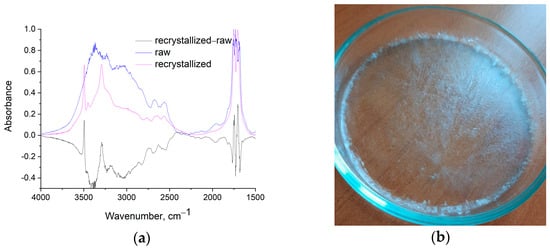 (a) FTIR spectra of the raw and the recrystallized samples and their subtracted spectra (recrystallized-raw) and (b) photograph of the recrystallized sample after solvent evaporation showing a film poor formation.